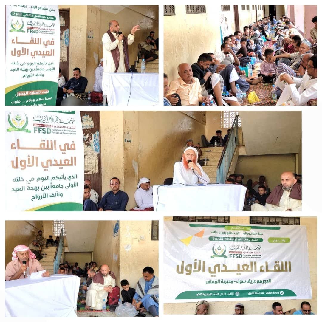 في أجواءٍ مفعمةٍ بالمحبة والبهجة، وتحت شعارٍ يحمل معاني التآخي والتلاحم، أقيم اللقاء العيدي الأول في مدرسة المعافر، الحجر مع عريف سواء، الذي نظمه منتدى فجر الأمل الثقافي التابع لمؤسسة فجر الأمل الخيرية للتنمية الاجتماعية، بحضورٍ بهيّ جمع بين الجموع الغفيرة والشخصيات الاجتماعية والوجاهات المجتمعية.