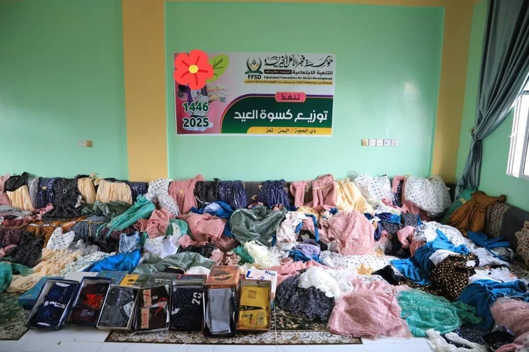 ضمن مشاريعها العيدية وزعت مؤسسة فجر الأمل الخيرية للتنمية الاجتماعية كسوة العيد لعدد ٢٨٠ طفل وطفلة من اليتيمات والفقراء في مديرية المعافر ممن لايتمكنون من شراء ثياب العيد لحالة الفقر والبؤس التي يعيشونها.