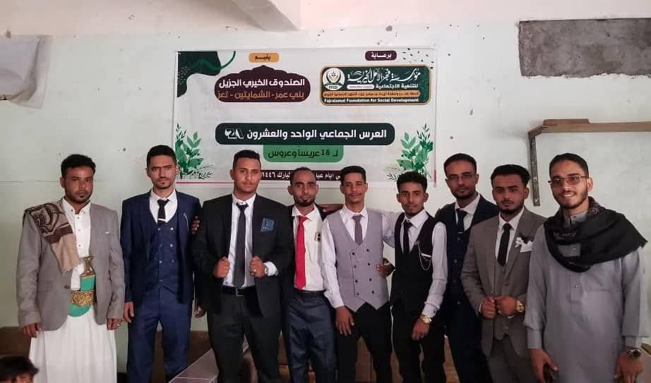 18 عريس وعروس برعاية مؤسسة فجر الأمل الخيرية أقام الصندوق الخيري بالجزيل بني عمر مديرية الشمايتين تعز العرس الجماعي ال21 لعدد 18 عريسآ وعروس اليوم السبت ثاني ايام عيدالأضحى المبارك..ياتي هذا العرس ضمن اهتمام مؤسسة فجر الامل الخيرية في مساعدة الشباب المعسرين بتخفيف معاناتهم وتشجيعهم على اقامة الاعراس الجماعية التي تخفف الأعباء عن كاهل العرسان.