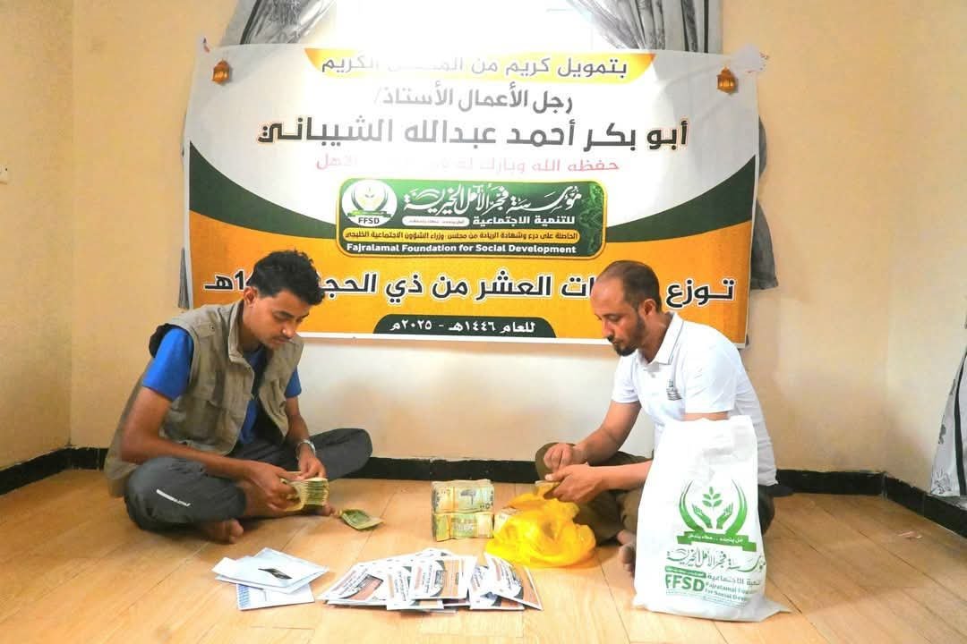 تمويل كريم من رجل الأعمال الأستاذ/ابوبكر أحمد عبدالله الشيبانيمؤسسة فجر الأمل الخيرية للتنمية الإجتماعيةتوزع صدقات العشر من ذي الحجة على عدد من الأسر الفقيرة والمتعففة في بعض القرى والحارات بتعز تأتي هذه اللفتة الكريمة في ظل ظروف كارثية حرجة واحوال معيشية صعبة يعيشها ابناء محافظة تعزالمسفيدين عبروا عن جزيل شكرهم للداعم،الاستاذ محمد القاسم مدير فجر الأمل قال أن هذه البصمة للاستاذ ابوبكر الشيباني ليست غريبة عنه فهو الداعم لكثير من مناشطنا منذ التأسيس ومن ابرزها الصيدلية المجانية متمنياً له التوفيق والسداد في جميع اعماله.ب