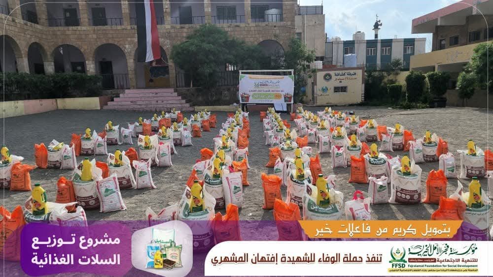 بتمويل كريم من فاعلات خير جزاهن الله خير الجزاء .مؤسسة فجر الأمل الخيرية للتنمية الإجتماعية تنفذ حملة الوفاء للشهيدة إفتهان المشهري رحمة الله عليها توزيع السلل الغذائية على بعض الأسر الفقيرة والمتعففةاليمن / تعز ربيع ثاني 1447ه