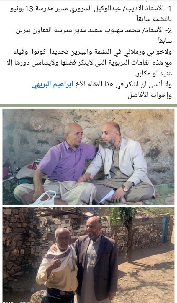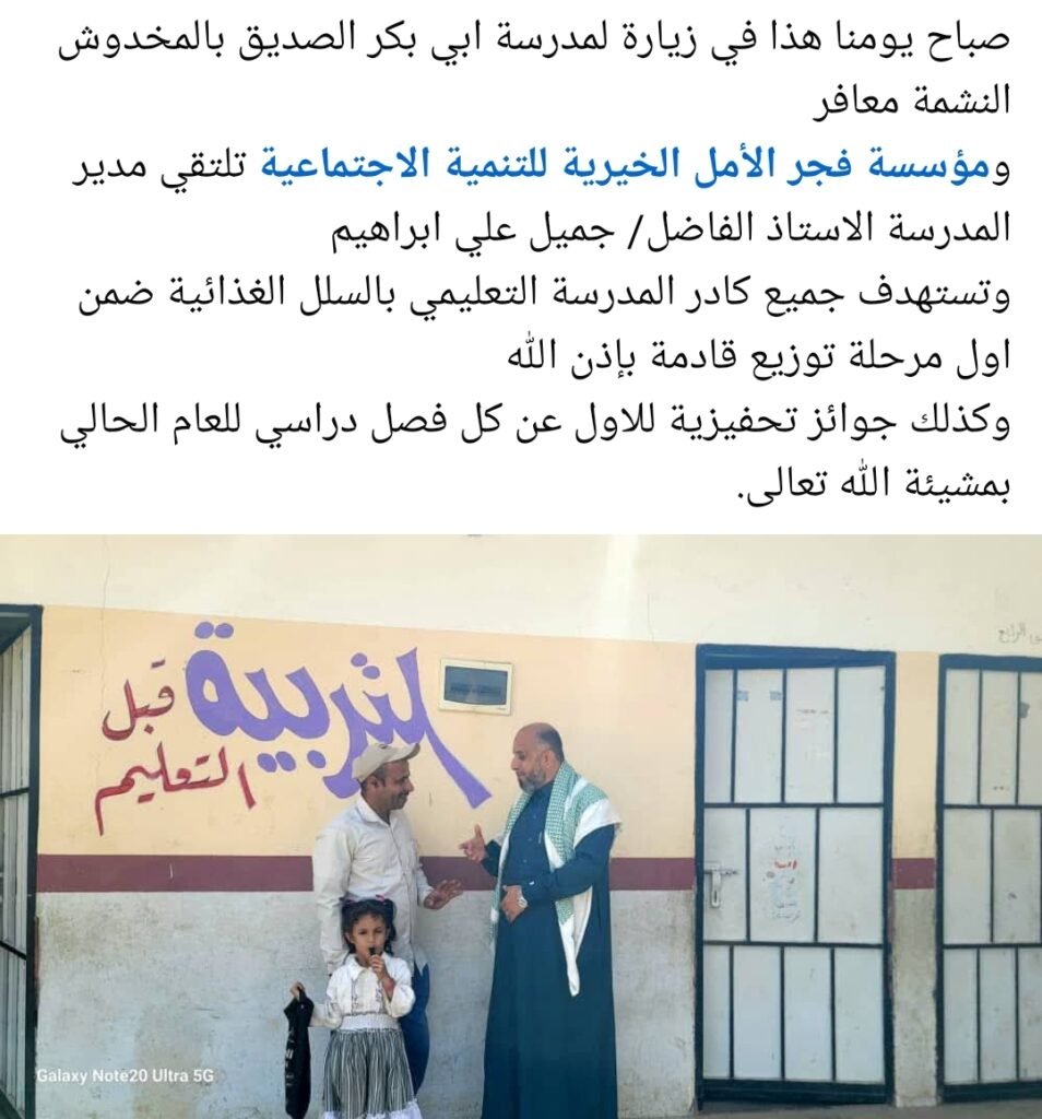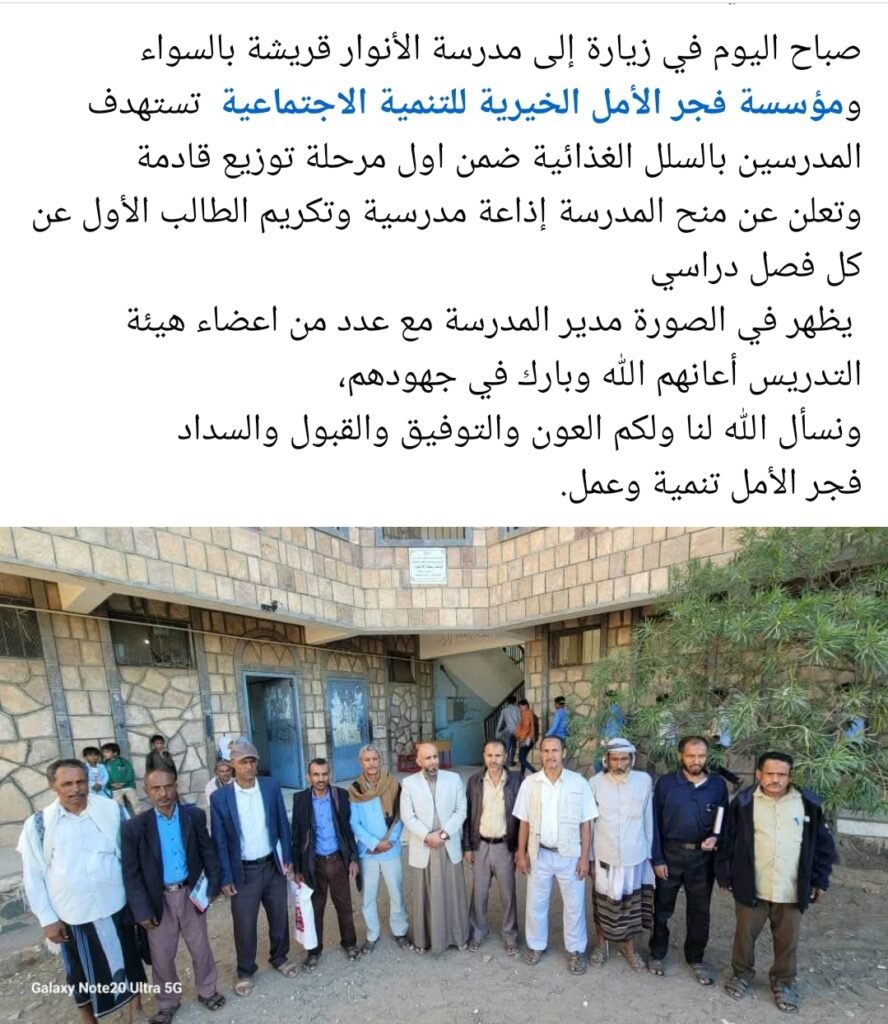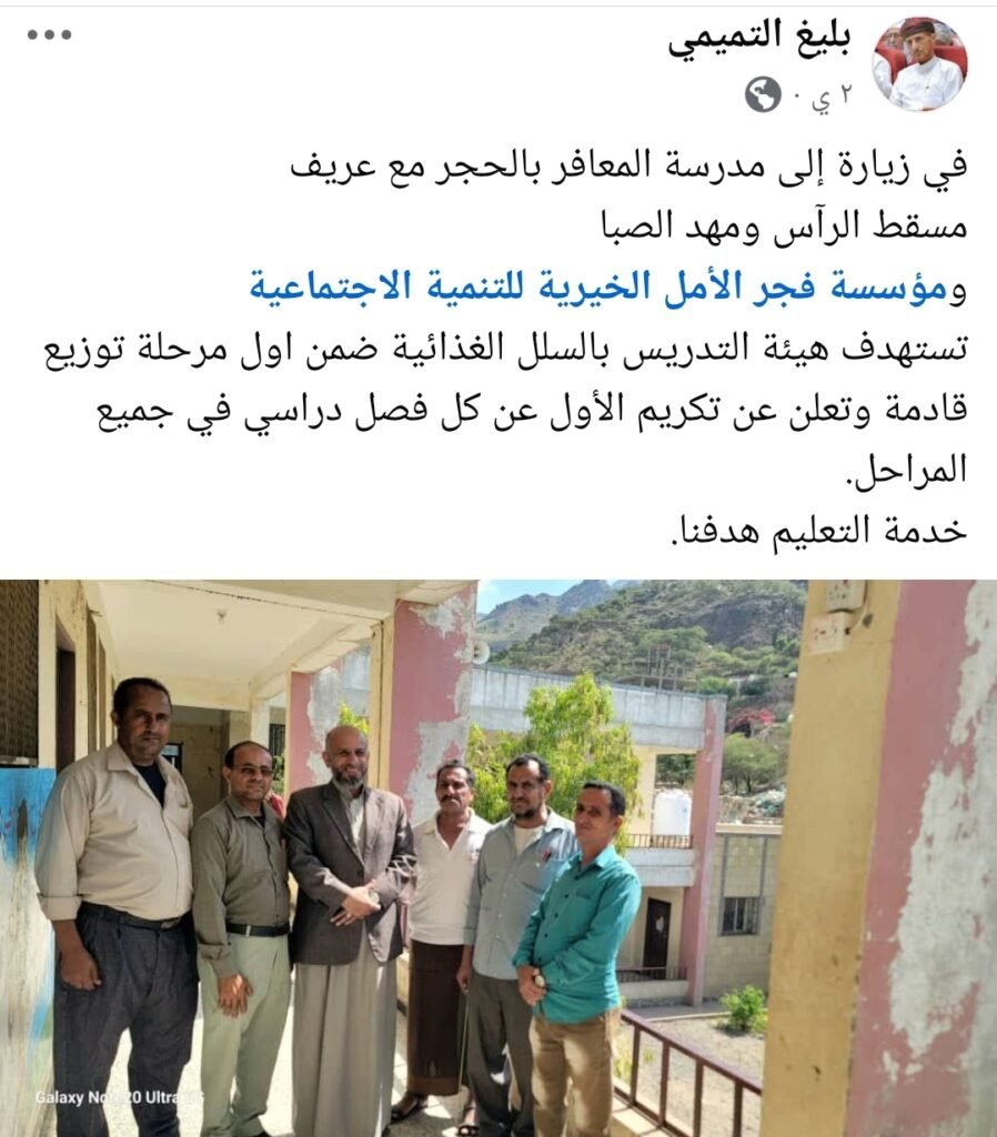 نتيجة للحالة المعيشية الصعبة والمتدنية التي وصل اليها موظفو الدولة بسبب انقطاع رواتبهم لاكثر من اربعة اشهر وخوفا منه عن توقف وتعطل الكثير من المرافق الحكومية عن تقديم خدماتها لابناء المجتمع نتيحة عجز اغلبية الموظفين من الاستمرار في اداء مهامهم واستشعاراٌ منه بالمسؤلية تجاه استمراية تقديم الخدمات التعليمية والصحية تجاه ابناء المجتمع في مديرية المعافر قام رئيس مؤسسة فجر الامل الخيرية للتنمية الاجتماعية الشيخ بليغ التميمي خلال الايام الماضية بزيارات تفقدية لعدد من المدارس والمرافق الحكومية والاسر المنكوبة في عدد من قرى وعزل مديرية المعافر مقدما يد العون والمساهمة في دعم المتطلبات التشغيلية والوقوف الى جانب المئات من المعملين والمعلمات والموظفين عبر استهدافهم بالسلة الغذائية تخفيفا من معاناتهم المعيشية الصعبة نتيحة انقطاع الرواتب لاكثر من اربعة اشهر..