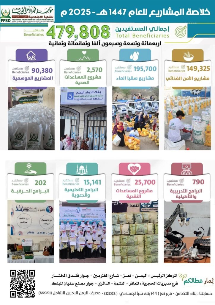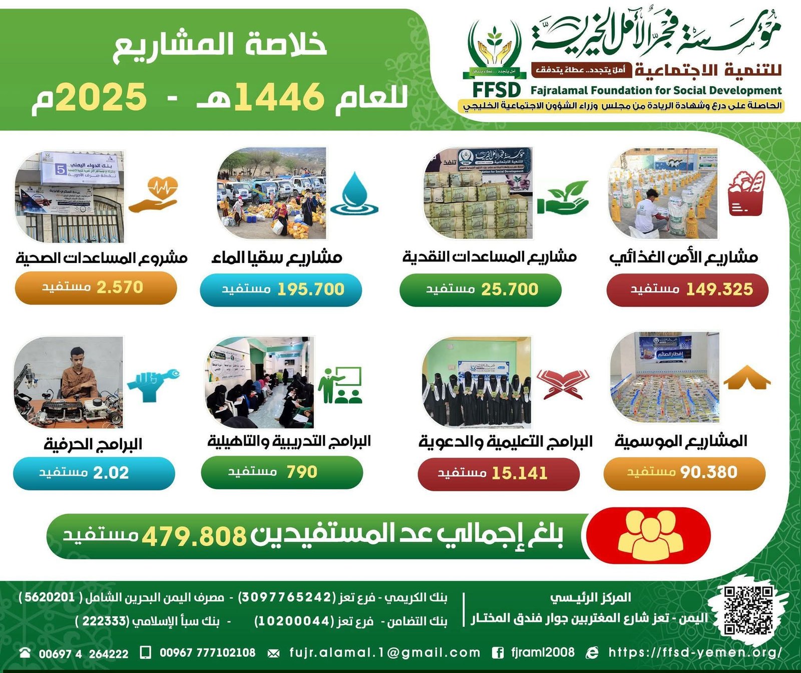 فجر الامل تنشر تقريرها الختامي لعام 2025 م باجمالي وصل الى 479808 مستفيد من مشاريعها الخيرية بمحافظة تعز* في وداع 2025م واستقبال 2026م* تقف مؤسسة فجر الأمل الخيرية للتنمية الإجتماعية على عتبات عام جديد مودعة العام 2025م وكلها فخر واعتزاز بما قدمته من إنجازات خيرية في مختلف المجالات. حيث بلغ عدد المستفيدين للعام 2025م 479808 أربعمائة وتسعة وسبعون ألفا وثمانمائة وثمانية مستفيد من مشاريعها والتي توزعت بين الأمن الغذائي والمساعدات النقدية والطبية وسقيا الماء والمشاريع الموسمية والاجتماعية والبرامج العلمية والدعوية وبرامج التدريب والتأهيل والبرامج الحرفية .وما كان لهذا الإنجاز أن يتم لولا توفيق الله سبحانه وتعالى لنا ثم دعم وكرم وجود رجال الخير والإحسان والجهات الداعمة نسأل الله أن يجزي كل الداعمين أفراد وجهات خير الجزاء و يبارك لهم في المال والأهل ويزيدهم من فضله