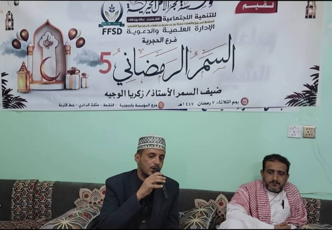 #أحيت_مؤسسة_فجر_الأمل_الخيرية للتنمية الاجتماعية أمسيةً رمضانيةً إيمانيةً مميزة في فرع الحجرية، ضمن أنشطتها الدعوية والثقافية لشهر الخير والبركات، وذلك في أجواءٍ إيمانيةٍ عامرةٍ بالمودة والتآلف، وحضورٍ لافتٍ من الوجهاء والشباب ورواد العمل الخيري.وتخللت السمر الرمضاني فقرات هادفة ومتنوعة، شملت كلماتٍ توجيهية عن فضائل شهر رمضان وأهمية استثمار أيامه ولياليه في الطاعات والقربات، مشيرةً إلى أن مثل هذه اللقاءات تسهم في ترسيخ معاني التكافل والتراحم، وتوثيق أواصر التعاون بين أفراد المجتمع.إلى جانب مسابقات ثقافية وتفاعلية عززت روح الأخوة والتنافس في الخير، وفقرات إنشادية معبّرة أضفت على الأمسية أجواءً روحانية مؤثرة.الثلاثاء 7 رمضان 1447هـ #فجر_الأمل_الخيرية #الإدارة_العلمية_والدعوية #بالقرآن_نرقى_ونسمو
